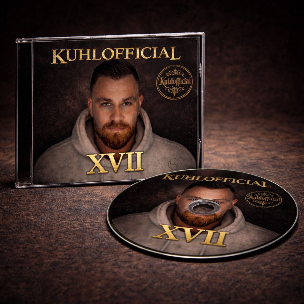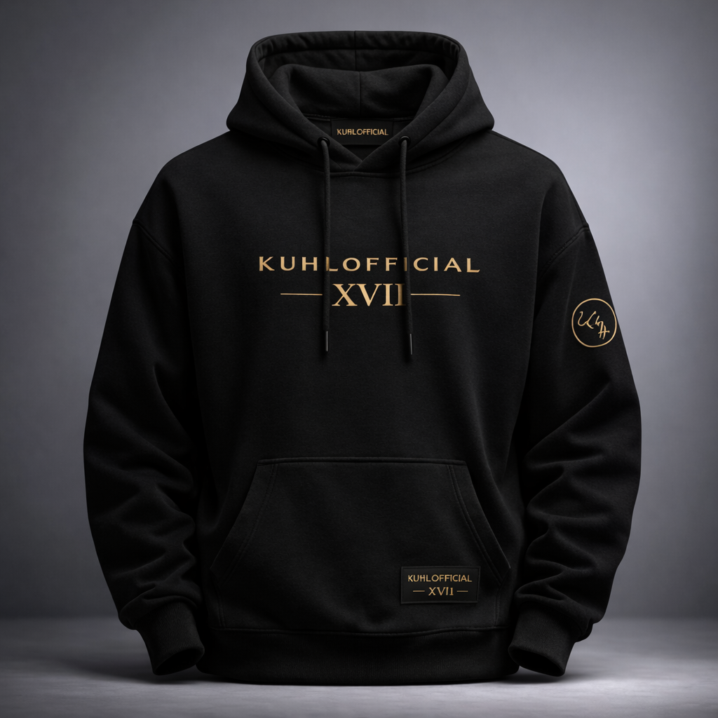 Das tiefe Schwarz trifft auf edle goldene Details – klar, kraftvoll und zeitlos. Das markante „KUHLOFFICIAL XVII“-Design auf der Brust spiegelt die Ästhetik des Albums wider und macht den Hoodie zu einem echten Statement-Piece.